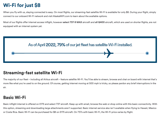 Il veloce Wi-Fi satellitare che ti ha permesso di navigare e fare streaming con facilità sui tuoi voli Alaska Airlines ha appena ottenuto una riduzione del prezzo: puoi fare quelle cose su Internet che sai fare così bene con la nostra nuova tariffa fissa di $ 8 per il servizio Wi-Fi sul nostro aereo principale con satellite -connettività abilitata a bordo. E a partire da ora, offriamo una varietà di nuove selezioni di pasti sui nostri voli come parte del programma di cibo e bevande più completo del settore.