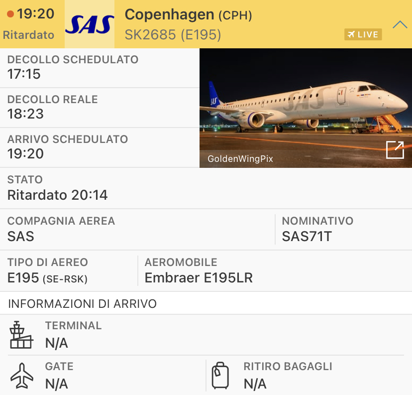 L’aereo arrivera’ da Copenaghen, presumibilmente e’ la prima volta che questo aereo della sussidiaria dell’aerolinea scandinava arriva in Italia.