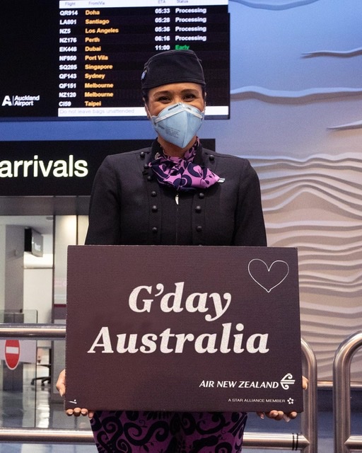 Air New Zealand cosi simpaticamente e semplicemente da il benvenuto ai primi viaggiatori provenienti da Oz e diretti verso Aotearoa, la grande nuvola bianca.