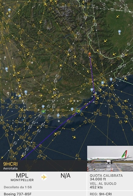 L’arrivo all’aeroporto Ridolfi e’ previsto nel corso del tardo pomeriggio/serata. Ora e’ sulle Alpi francesi a FL340.