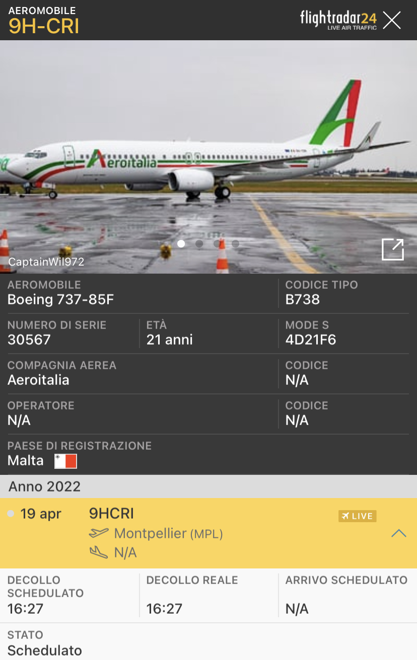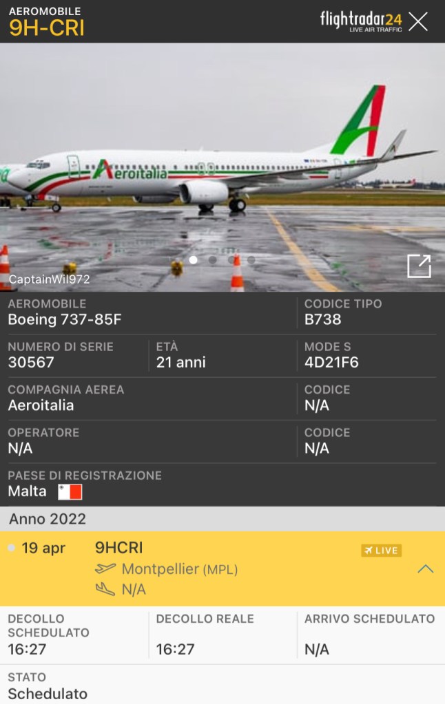 Il B737/800 9H-CRI della AeroItalia e’ decollato questo pomeriggio alle 16:08 per un volo di trasferimento da Montpellier a Forli.