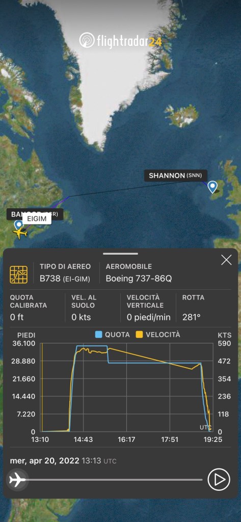 L’aereo e’ giunto a Shannon, proveniente da San Bernardino in California via Bangor nel Maine.