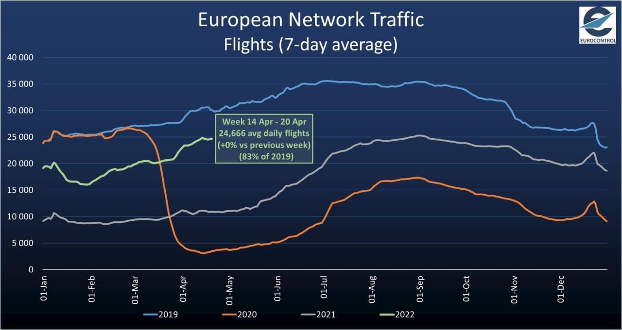 Inizia a ingranare il traffico in generale. -17,4% sul 2019, ma parliamo sempre di traffico globale, qui di dei cinque segmenti (linea, low cost, charter, cargo, biz aviation).
