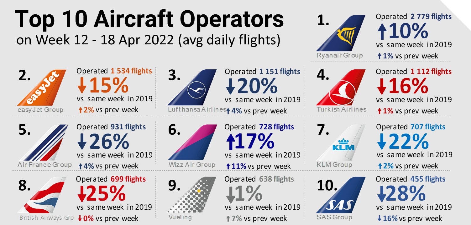 Solo due vettori, Ryanair e Wizzair erano sopra la soglia del 2019. Vueling e’ a -1%, le altre sette aerolinee europee nel novero delle prime 10 somo ancora negative anche a doppia cifra.