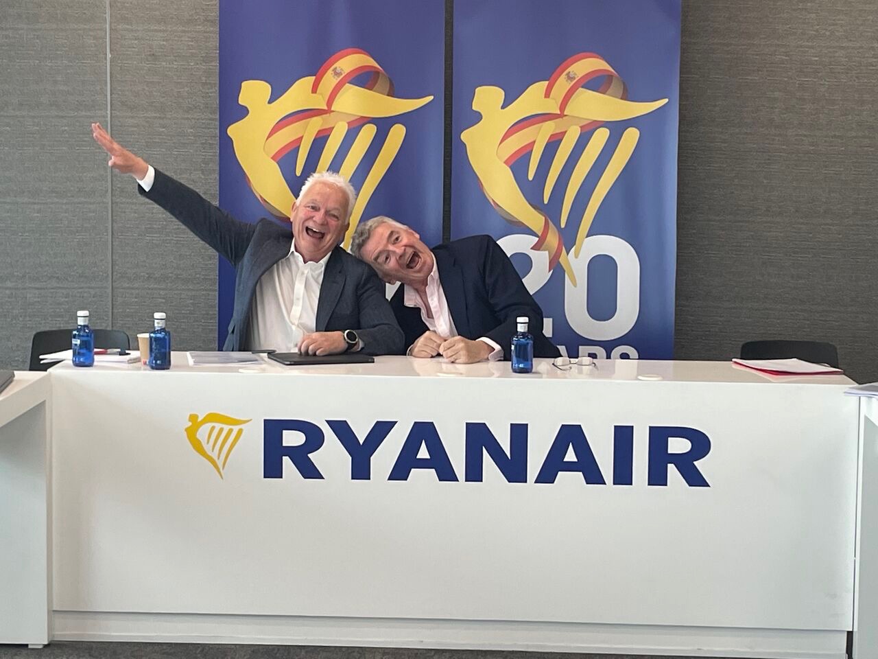 Michael O’Leary – AD Ryanair Group a destra e Eddie Wilson – AD Ryanair DAC festeggiano i 20 anni di Ryanair in Spagna.