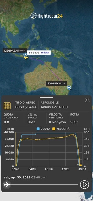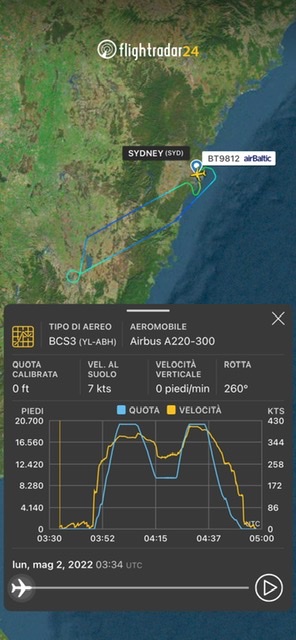 Quindi oggi, ora in Australia sono otto ore avanti a noi, un volo BT9812 da Sydney a Sydney con sorvolo della citta’ dopo il decollo. Tempo totale 1 ora e 4 minuti.