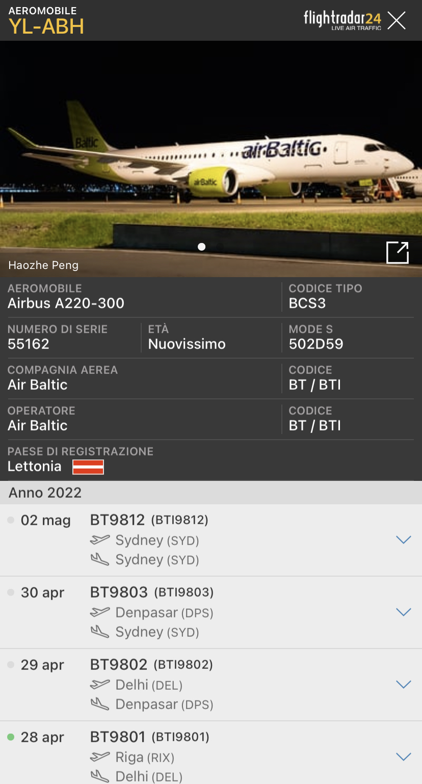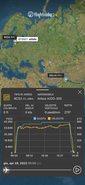 L’A220-300 YL-ABH e’ partito il 28 aprile da Riga a Delhi compiuta in 8 ore e due minuti come BT9801.