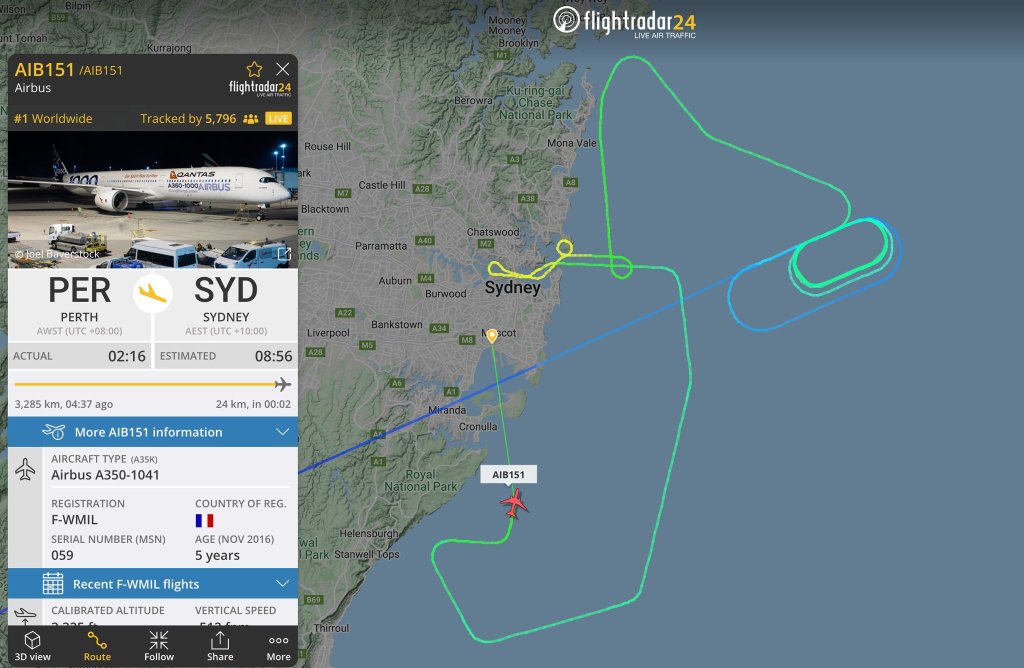 AIB151, in arrivo da Perth con destinazione Sydney per l’annuncio dell’ordine di Qantas piazzato alla casa costruttrice di aeromobili europea ha effettuato come si vede dal grafico un passaggio sull’Harbour Bridge.