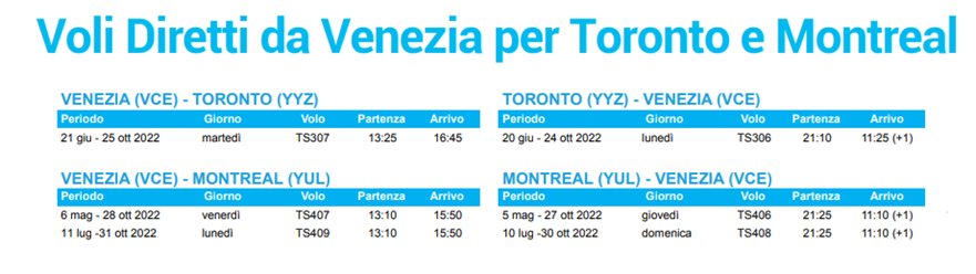 Voli Diretti (no-stop) da Venezia MONTREAL e TORONTO 2022