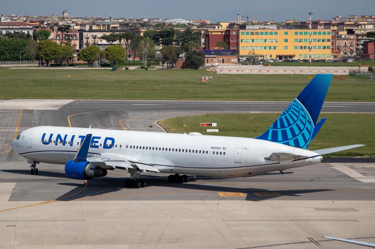 Il Boeing 767-300ER United prima di allinearsi per pista 06.