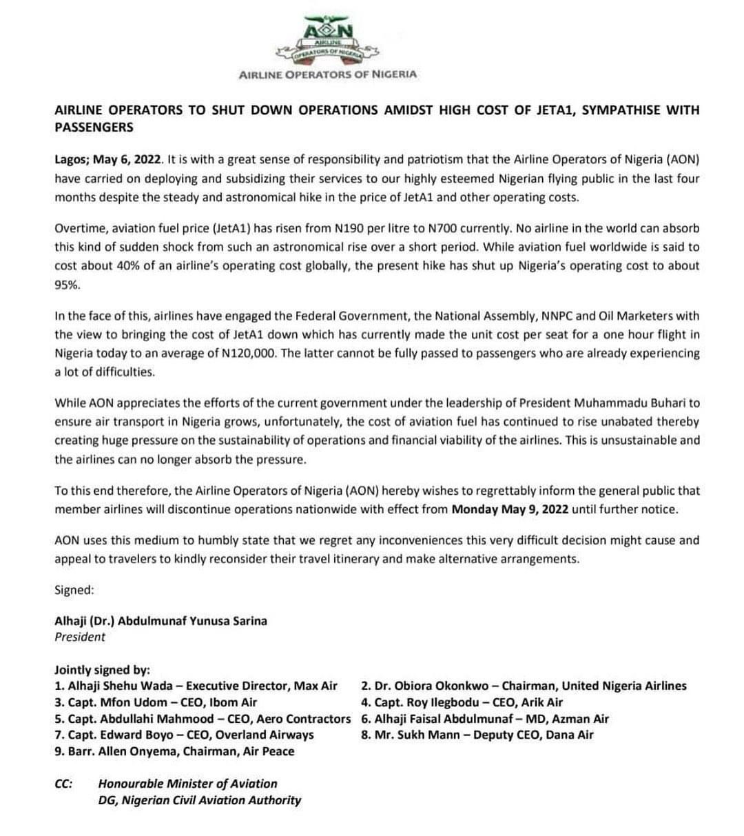 Visto il fatto che un volo di un ora ora assomma a N120000, un qualcosa che i cittadini nigeriani non possono sopportare per i gia’ loro grossi problemi di sopravvivenza con l’aumento dei prezzi. Le compagnie aeree associate in AON non vogliono trasferire i costi incrementati sui passeggeri, di qui la decisione comunicata anche al Presidente della Nigeria di sospendere i voli nazionali fino a nuova data, proprio per il fatto che anche i colloqui con chi commercializza carburante ( la Nigeria e’ uno dei principali produttori mondiali) non hanno avuto esito.