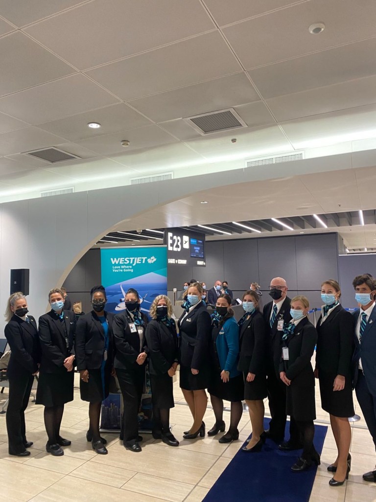 L’equipaggio della compagnia aerea canadese, la quale collega prima bisettimanalmente e poi trisettimanalmente fino all’autunno da Calgary per Roma Fiumicino, un volo nuovo in modo assoluto in quanto e’ la prima volta che le due citta’ sono collegate. A regime i collegamenti sono il venerdi /sabato/domenica dall’Italia. Il giorno prima in partenza dal Canada.