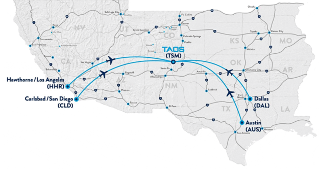 Taos Air il 30 giugno riavvierà il suo popolare servizio stagionale offrendo voli charter pubblici diretti da e per Austin–Bergstrom International, Dallas Love Field, Hawthorne Municipal Airport a Los Angeles e McClellan-Palomar Airport a Carlsbad.