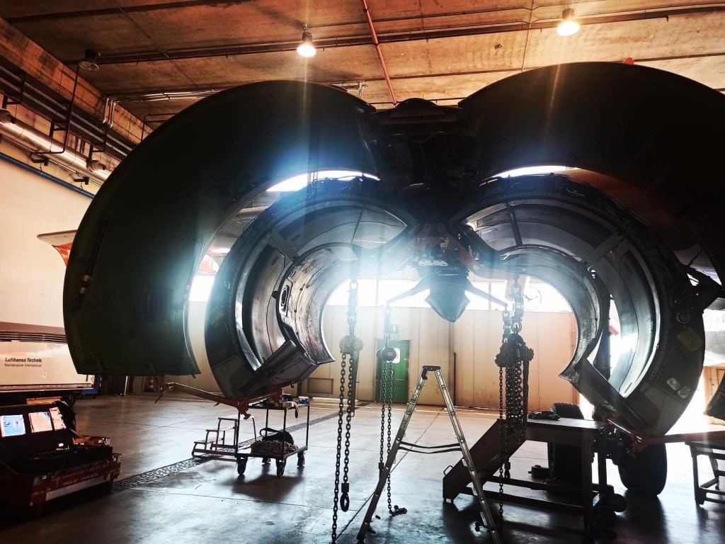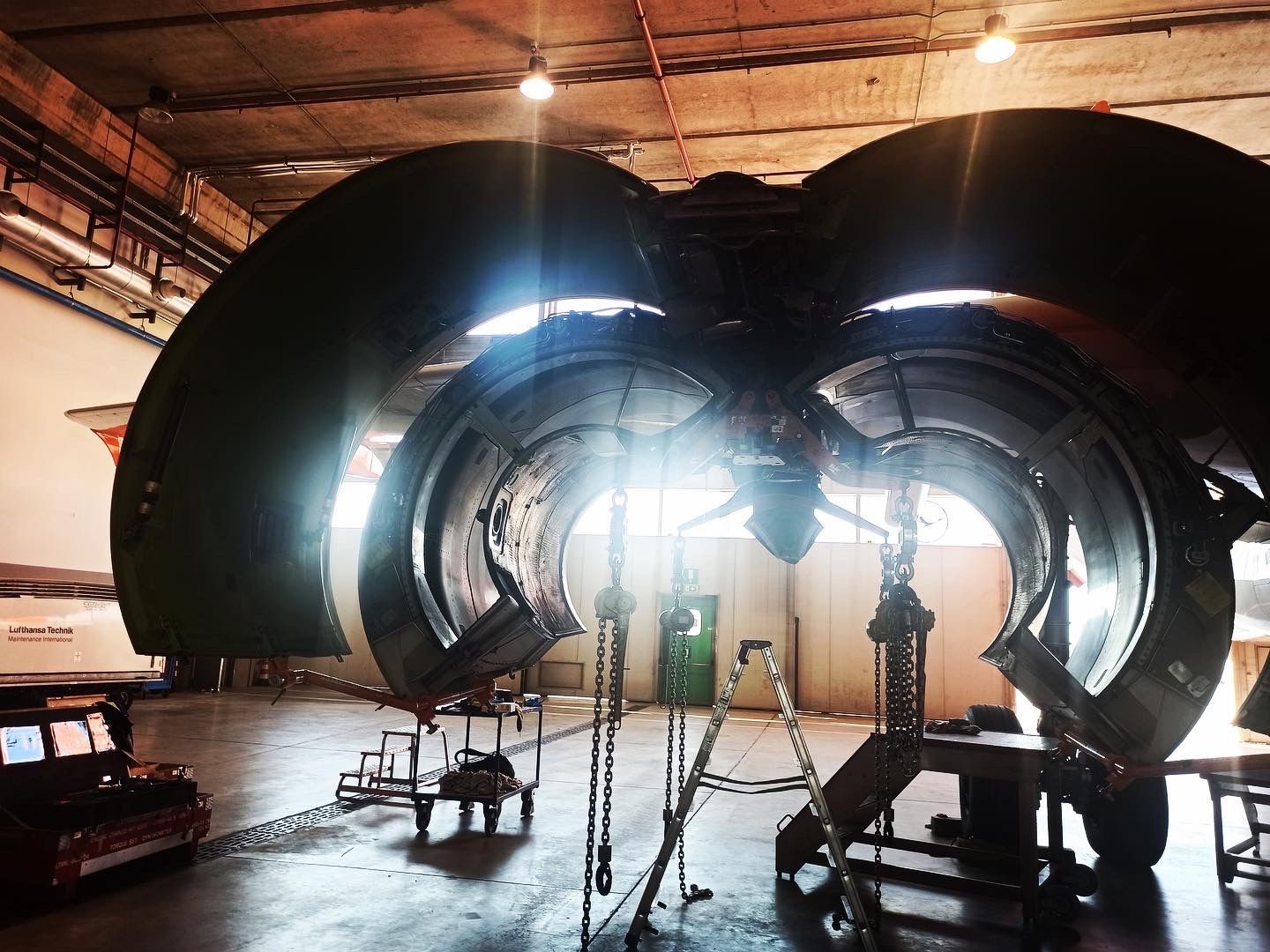 Nei suoi canali social la Lufthansa Technik Milano ha pubblicato le immagini circa un cambio motore a un A320 easyJet. Nella foto sotto la gondola motore con le nacelles aperte, si vedono chiaramente i supporti motore, e le varie connessioni elettriche e tubazioni varie.
