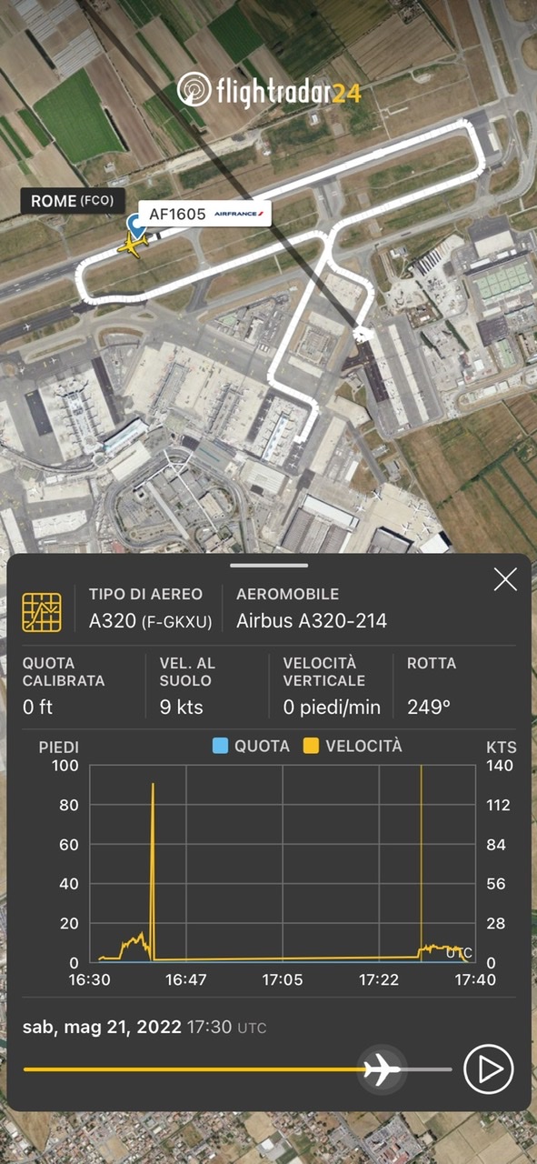 Alle 18:42 il volo AF1605 da Roma FCO a Parigi CDG ha iniziato la corsa di decollo sulla pista 25, riporta FR24 che ha interrotto la corsa di decollo, come si vede nel grafico dell’immagine. L’aereo e’ rimasto in pista a lungo fino alle 19:30 quando e’ stato trainato.