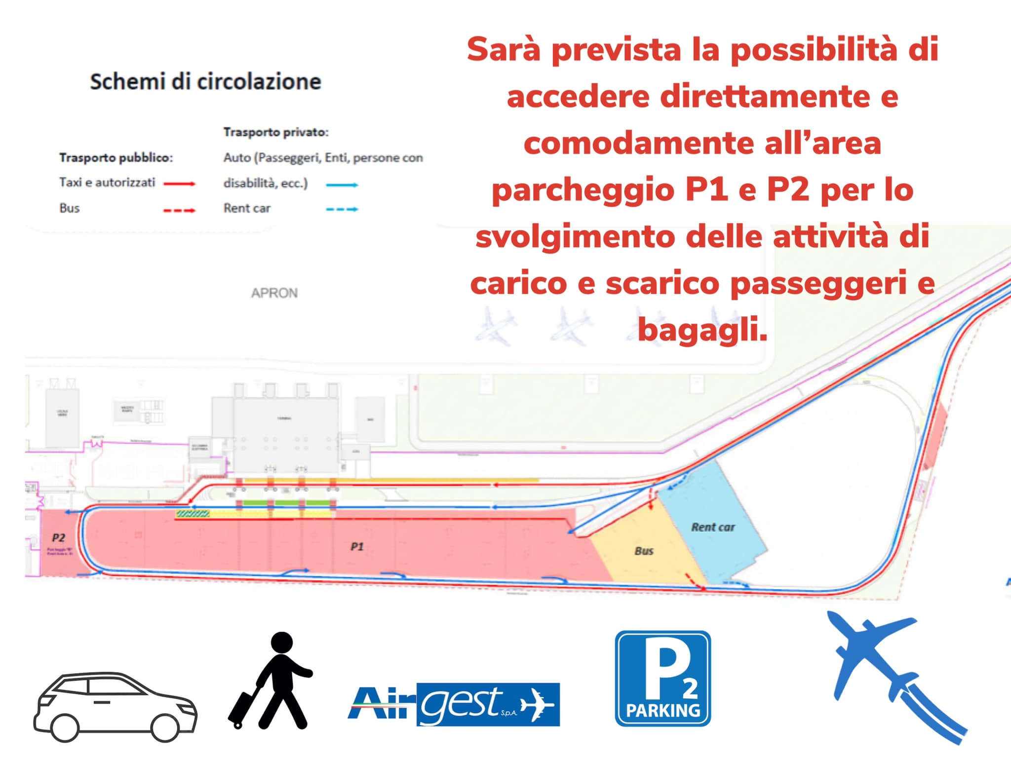 Per giungere alle aree riservate agli NCC (Noleggio con Conducente) si dovrà accedere al parcheggio P1. È stata creata un’area esclusivamente dedicata alla movimentazione e stazionamento dei bus per carico/scarico passeggeri e creato un sicuro percorso pedonale riservato, per il collegamento alla stazione bus e all’aria Rent a car. A ciò si aggiunge un’area riservata fronte terminal, all’interno del Parcheggio P1, agli operatori con licenza NCC (Noleggio con Conducente). Infine, un’area di sola fermata per la discesa dei passeggeri in partenza (Kiss&Fly) accompagnati con auto privata, di fronte al terminal partenze e arrivi.