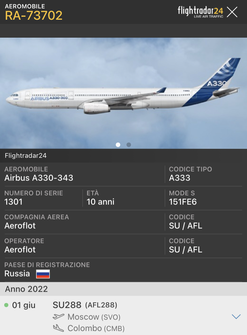 E’ atterrato alle 10:10 a Colombo proveniente da Mosca un A330-343 RA-73702 e anziche ripartire per lo stesso aeroporto di origine, l’equipaggio ha dovuto sbarcare perche’ il lessor americano Celestial e’ riuscito a impadronirsi del velivolo.