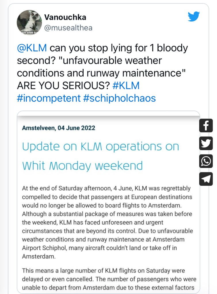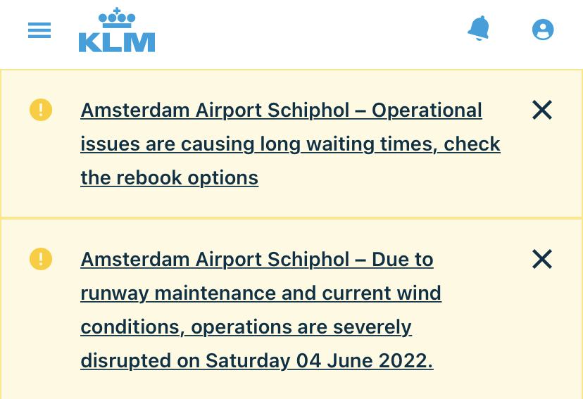 Le bugie di KLM sono incredibili. Nell’immagine tratta ora dalla sua homepage su mobile si giustificano i problemi in corso per il forte vento e lavori alla pista.