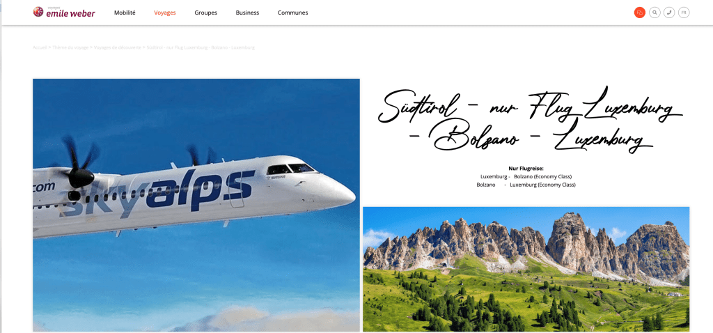 In queste settimane la SkyAlps ha operato una serie di voli settimanali da Lussemburgo a Bolzano per trasportare turisti lussemburghesi in Alto Adige. Non solo, anche verso il Lago di Garda. La cosa si replicherà in settembre con partenze il 13-20-27 settembre. L’aereo utilizzato è uil DHC-8/Q400 da 76 posti e il tour operator è Emilie Weber.