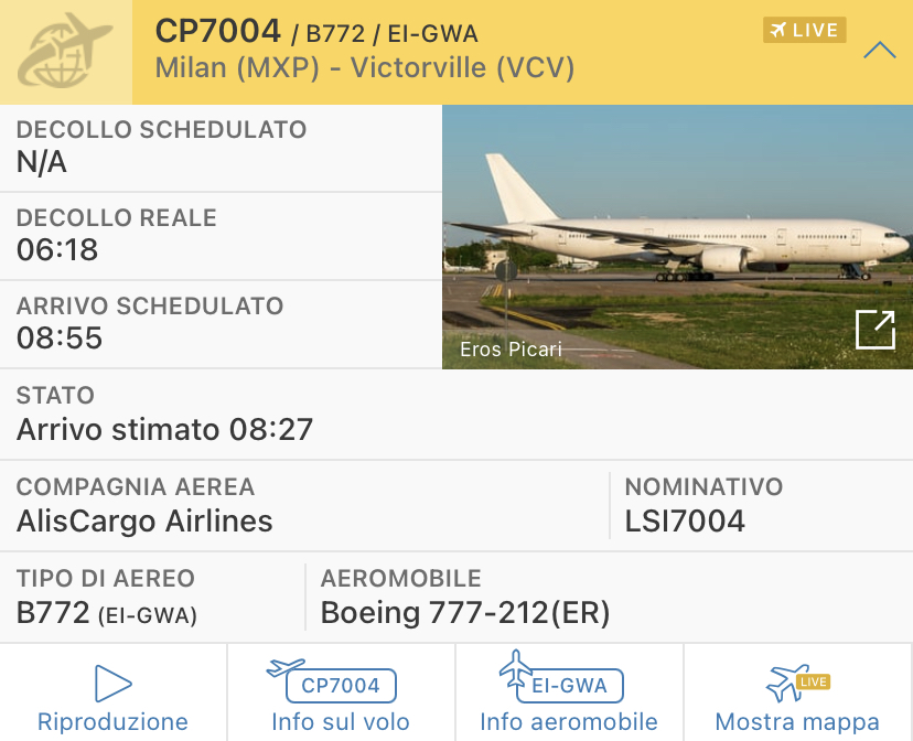 Il Boeing 777-212ER preighter EI-GWA e’ decollato da Milano Malpensa alle 6:08 come LSI/CP7004.