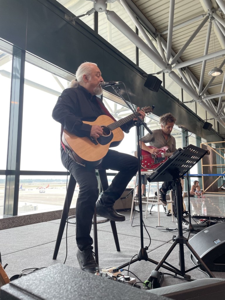 Qui in aeroporto dove un via vai di persone si incontrano casualmente, Finardi è stato decisamente un’inaspettata sorpresa. E se i voli accorciano le distanze, lo spazio dell’aerostazione, più raccolto rispetto alle grandi location dei concerti, permette un ascolto da molto vicino dei suoi maggiori successi intervallati con gli omaggi ai Grandi della Musica.