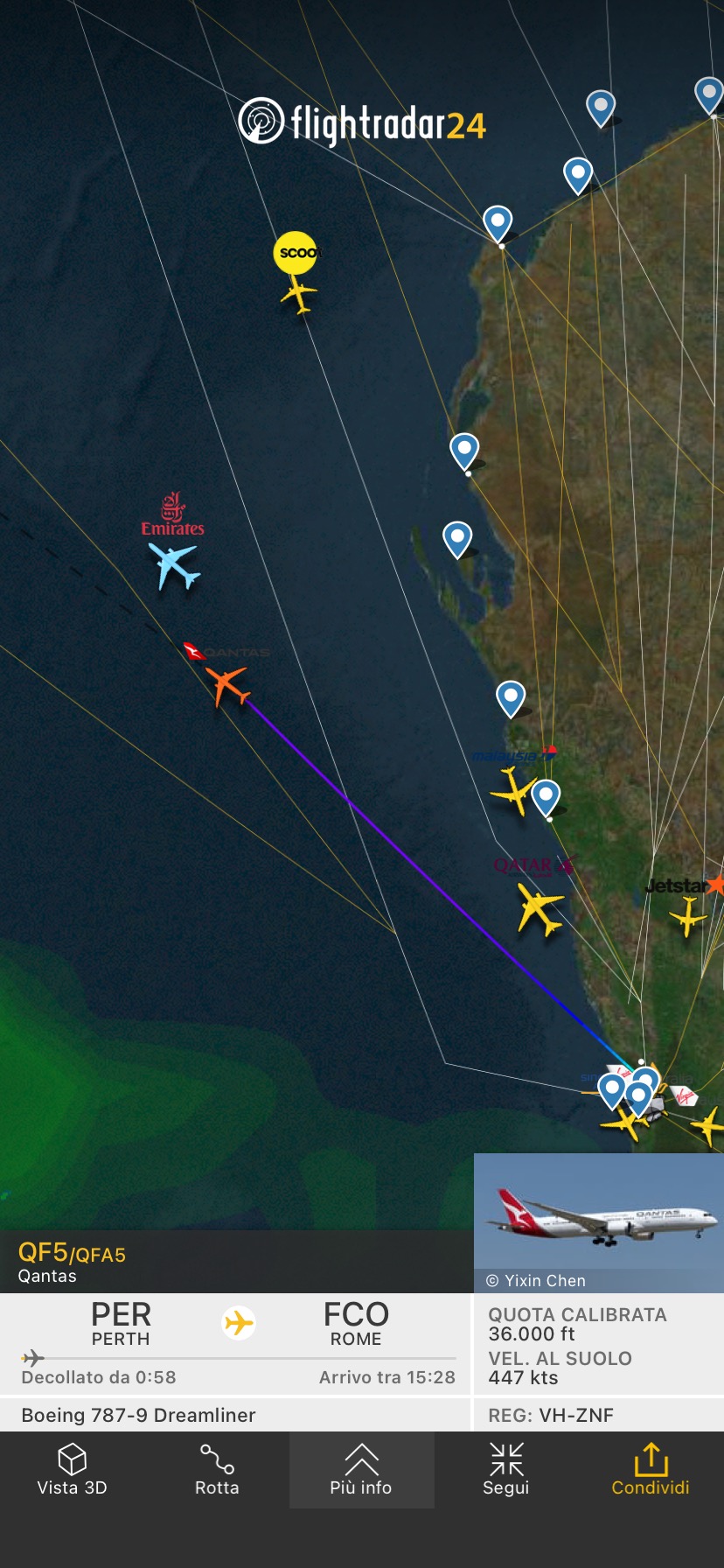 Senza categoria Qantas : ecco il primo Perth – Roma Pubblicato da Italiavola il 22 giugno 2022 Domani mattina alle 9 e’ previsto l’arrivo a Roma Fiumicino del primo volo QF5 da Perth-Sydney. Il B787-9 VH-ZNF di Qantas e’ decollato con 14 minuti di ritardo e il volo e’ previsto di una durata di 16 ore e 25 minuti. Condividi: Fai clic per condividere su Facebook (Si apre in una nuova finestra) Facebook Fai clic qui per condividere su LinkedIn (Si apre in una nuova finestra) LinkedIn Fai clic qui per condividere su Reddit (Si apre in una nuova finestra) Reddit Fai clic qui per condividere su Pinterest (Si apre in una nuova finestra) Pinterest Fai clic qui per condividere su Tumblr (Si apre in una nuova finestra) Tumblr Fai clic per condividere su X (Si apre in una nuova finestra) X Mi piace Caricamento... Correlati
