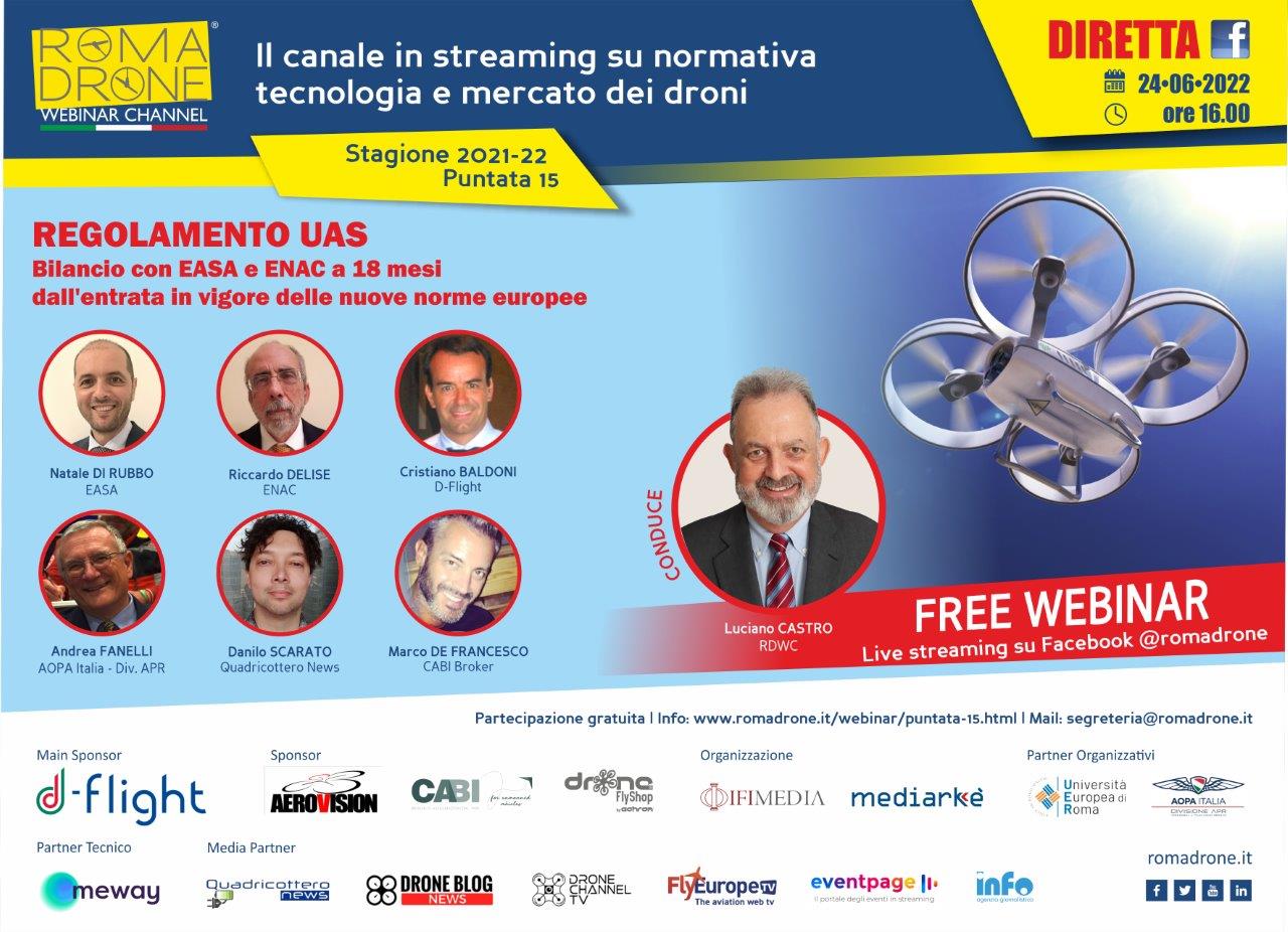 “Regolamento UAS. Bilancio con EASA e ENAC a 18 mesi dall’entrata in vigore delle nuove norme europee”. Sarà questo il tema della prossima puntata di “Roma Drone Webinar Channel” (RDWC), il canale online su normativa, tecnologia e business degli Unmanned Aerial System (UAS), giunto al termine della terza stagione. Questa puntata sarà trasmessa venerdì 24 giugno (dalle ore 16) in diretta streaming sulla pagina Facebook di Roma Drone e sul canale Youtube di Quadricottero News. Interverranno diversi ospiti: Natale Di Rubbo (EASA), Riccardo Delise (ENAC), Cristiano Baldoni (D-Flight), Andrea Fanelli (AOPA Italia-Divisione APR), Danilo Scarato (Quadricottero News), Marco De Francesco (CABI Broker).
