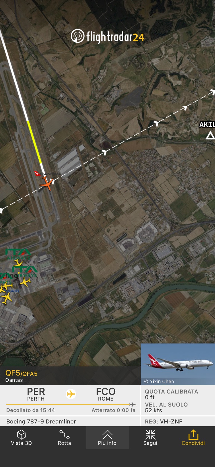 Il Boeing 787-9 VH-ZNF ha utilizzato la pista 16L per atterrare a Roma Fiumicino, fatto inusuale perche’ di solito e’ la 16R quella dei voli intercontinentali.