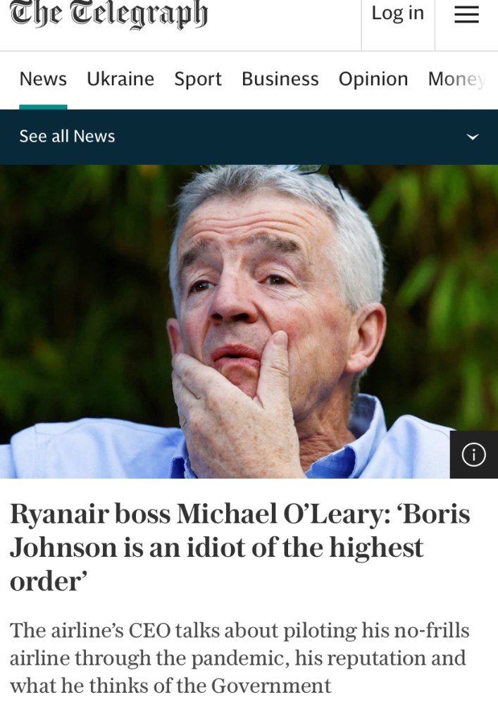 Il The Telegraph ha raccolto il punto di vista molto piccato di Michael O’Leary sul PM inglese Boris Johnson. Nel beve o nel male il driver del vettore lowcost irlandese non le manda a dire come e’ di suo classico: