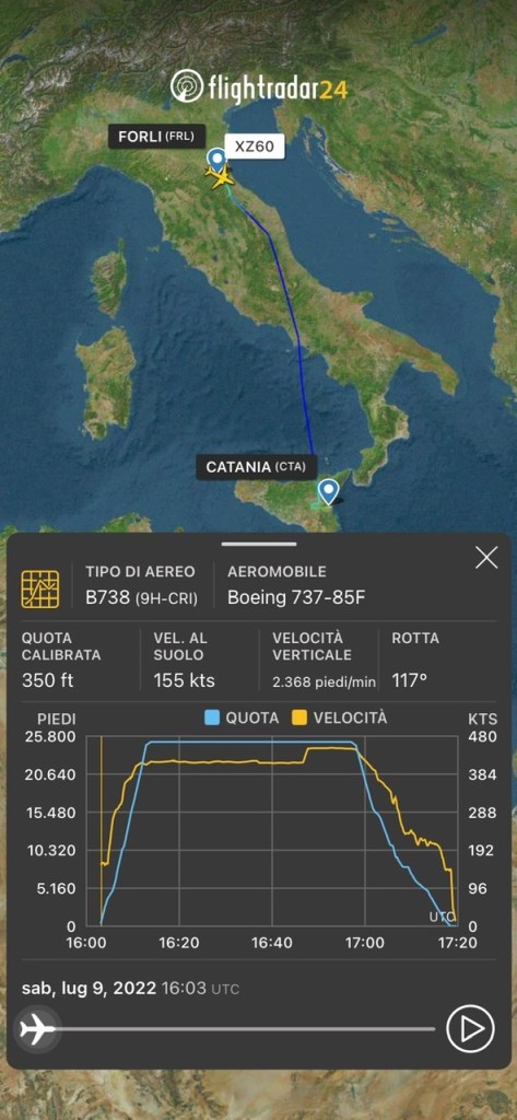 Il volo Forli – Catania ha volato a FL250 decollando alle 18:02 anziche le 14:55, L’atterraggio a Catania dopo un ora e 17 minuti alle 19:19. E’ ripartito da Catania alle 20:11 anziche alle 17:05. L’atterraggio alle 21:31 dopo un ora e 21 minuti di volo con quota di crociera massima a FL240.