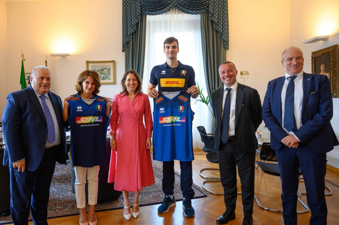 Lunedì pomeriggio il Presidente della FIPAV Giuseppe Manfredi e Nazzarena Franco AD DHL Express Italy, insieme al Capitano della Nazionale Maschile Simone Giannelli, hanno avuto l’onore e il piacere di consegnare in forma privata, la Maglia della Nazionale con il logo Arcobaleno alla Ministra per le pari opportunità e la famiglia, Elena Bonetti.