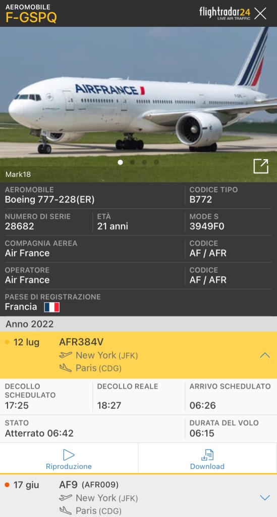 Nella prima mattinata di oggi come AFR384V da New York JFK è rientrato a Parigi CDG il Boeing 777-228ER F-GSPQ della Air France interessato dalla collisione con un Airbus 330-202 EI-EJL di ITA AIrways lo scorso 17 giugno 2022. Il velivolo ha toccato il suolo francese alle 06:42 di stamani.