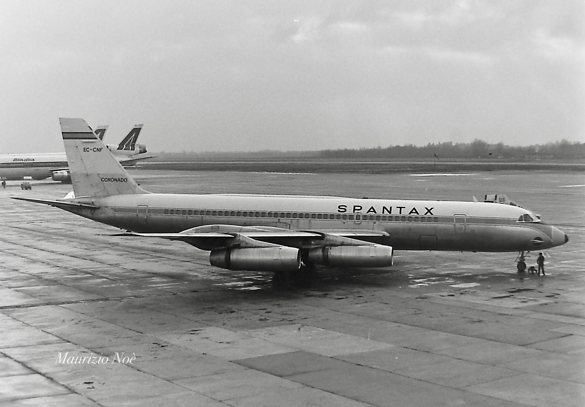 In questo caso è il Convair 990 Coronado della Spantax. il velivolo americano era un campione di velocità, aerodinamica e anche ahinoi consumi. Comunque negli anni 60 fu un progetto nato dall’estensione del precedente quadrigetto Convair 880.