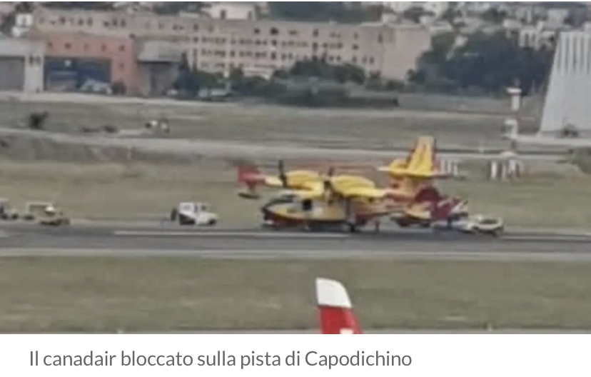 L’immagine e’ di Fanpage.it e mostra il Canadair antincendio bloccatosi in pista e cosi ha portato alla chiusura dello scalo campano per tre ore.