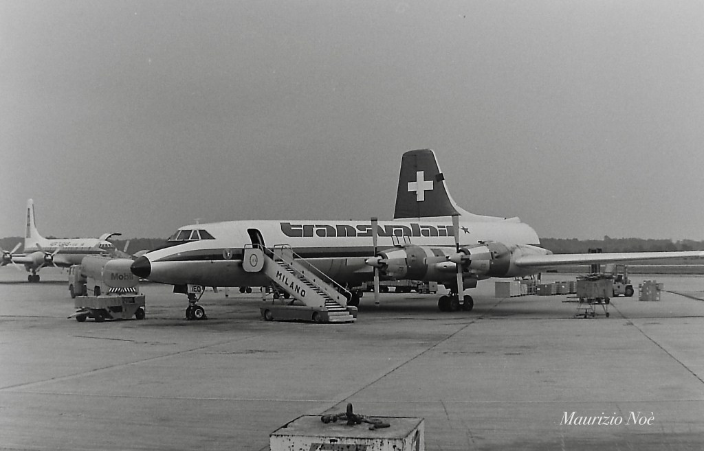 Se in fondo vediamo un Bristol Britannia della Aer Turas Cargo, Maurizio Noè con questa foto mette in accento la fase operativa di caricamento o scaricamento di questo CL-44.
