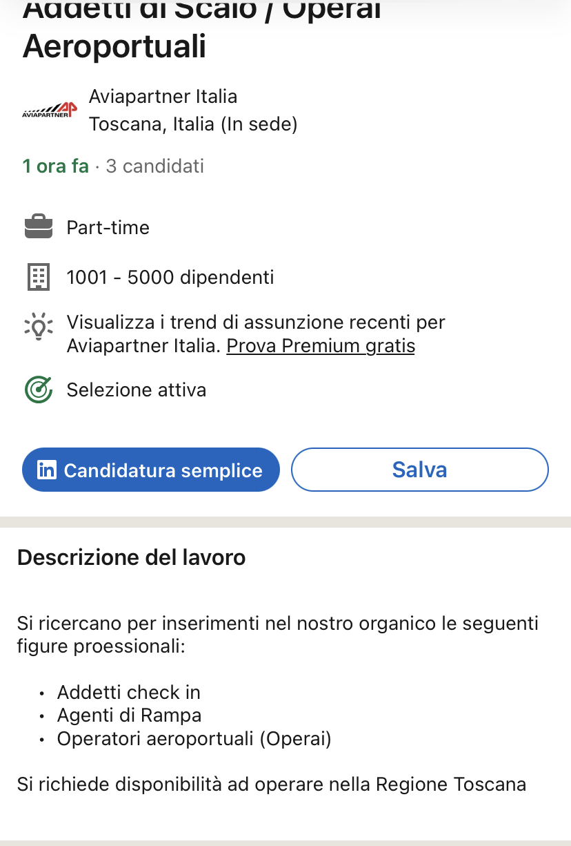 Aviapartner Italia sbarca in Toscana. Nella richiesta di candidature di lavoro la sede e’ per operare nella regione, quindi Pisa e Firenze, anche se non c’e’ scritto.