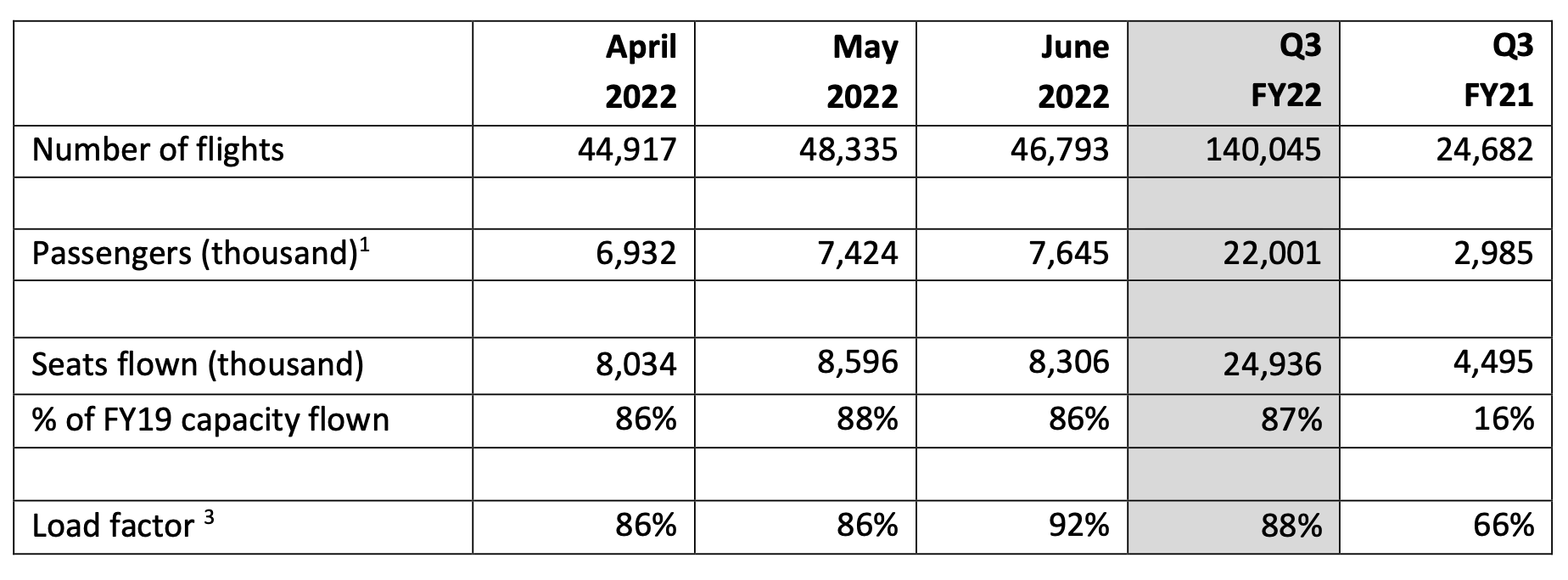 Il numero di passeggeri1 nel trimestre è aumentato a 22,0 milioni (T3 FY21: 3,0 milioni).