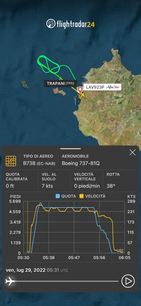 Questa mattina il Boeing 737/800 EC-NAB della AlbaStar era decollato per un volo ferry verso Bari, maraggiunta la quota di 5500 piedi ha fermato la salita ed è stato in holding a 5000 piedi dalle 5:36UTC alle 5:54UTC, poi ha iniziato la discesa per ritornare a Trapani dove è atterrato alle 6:00UTC, le 8 italiane.