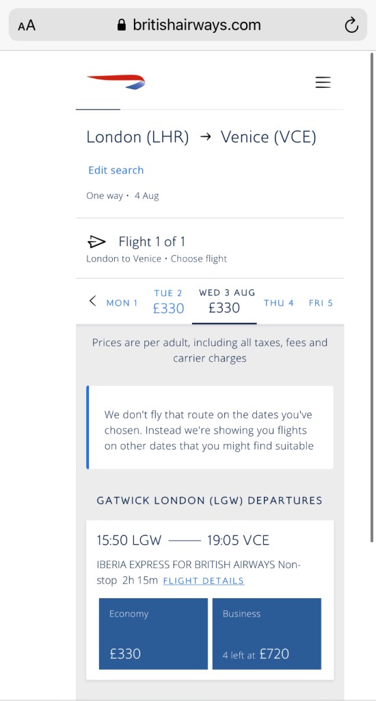 Nella foto sopra un esempio di tentativo di booking tra Londra Heathrow e Venezia, l’unica opzione e’ partire da Londra Gatwick.