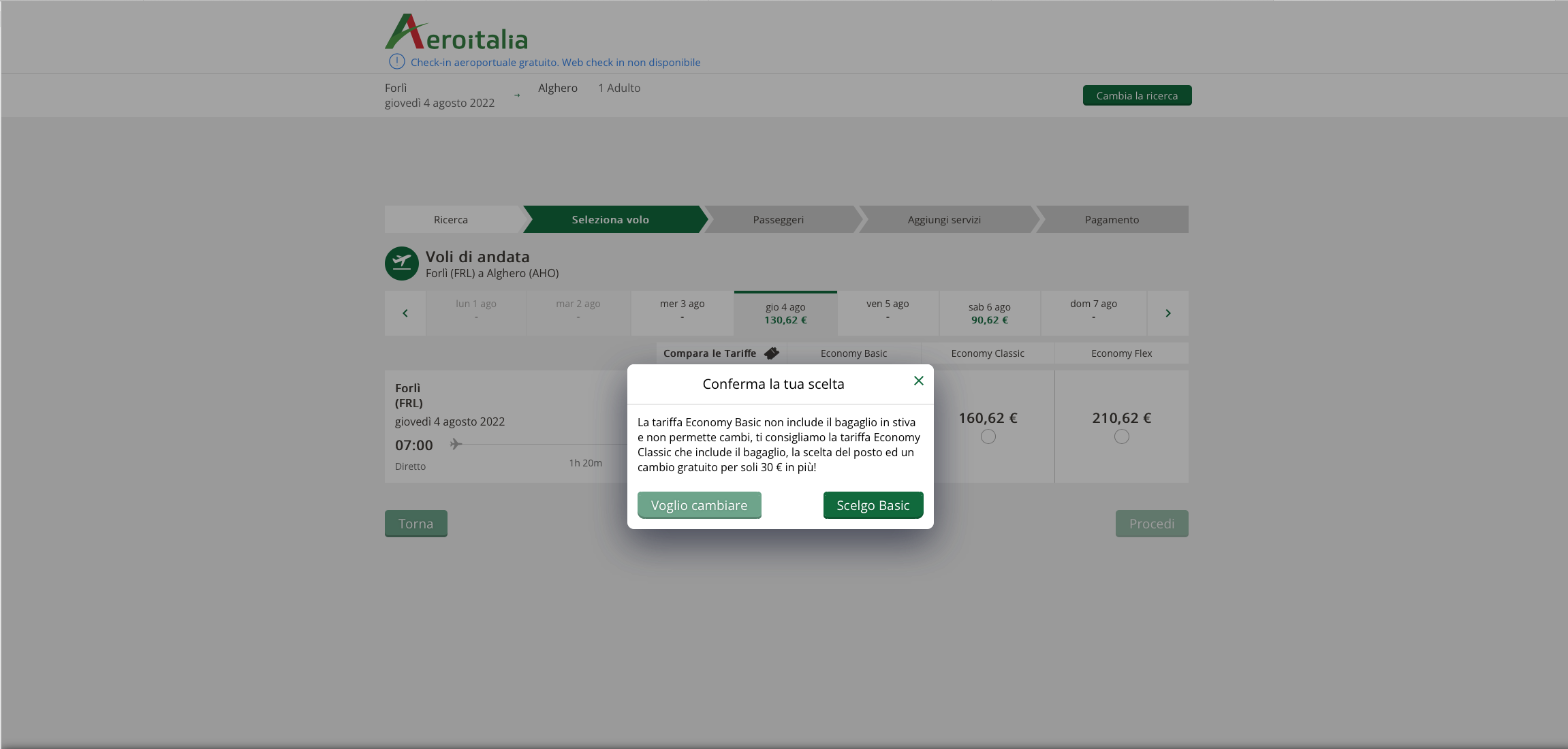 Il messaggio che compare selezionando la tariffa economy basic è questo: