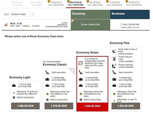 La nuova Green Fare viene offerta insieme alle ulteriori opzioni tariffarie disponibili – Light, Classic o Flex – nel processo di prenotazione. Le Green Fares possono essere prenotate da oggi tramite swiss.com per voli dalla Danimarca, Svezia o Norvegia verso destinazioni europee e sono disponibili sia per i viaggi in Economy che in Business Class. Anche i partner di viaggio B2B di SWISS in Scandinavia potranno usufruire della nuova opzione Green Fare da questo autunno in poi. La fase di prova delle nuove Green Fare si estenderà per circa sei mesi.