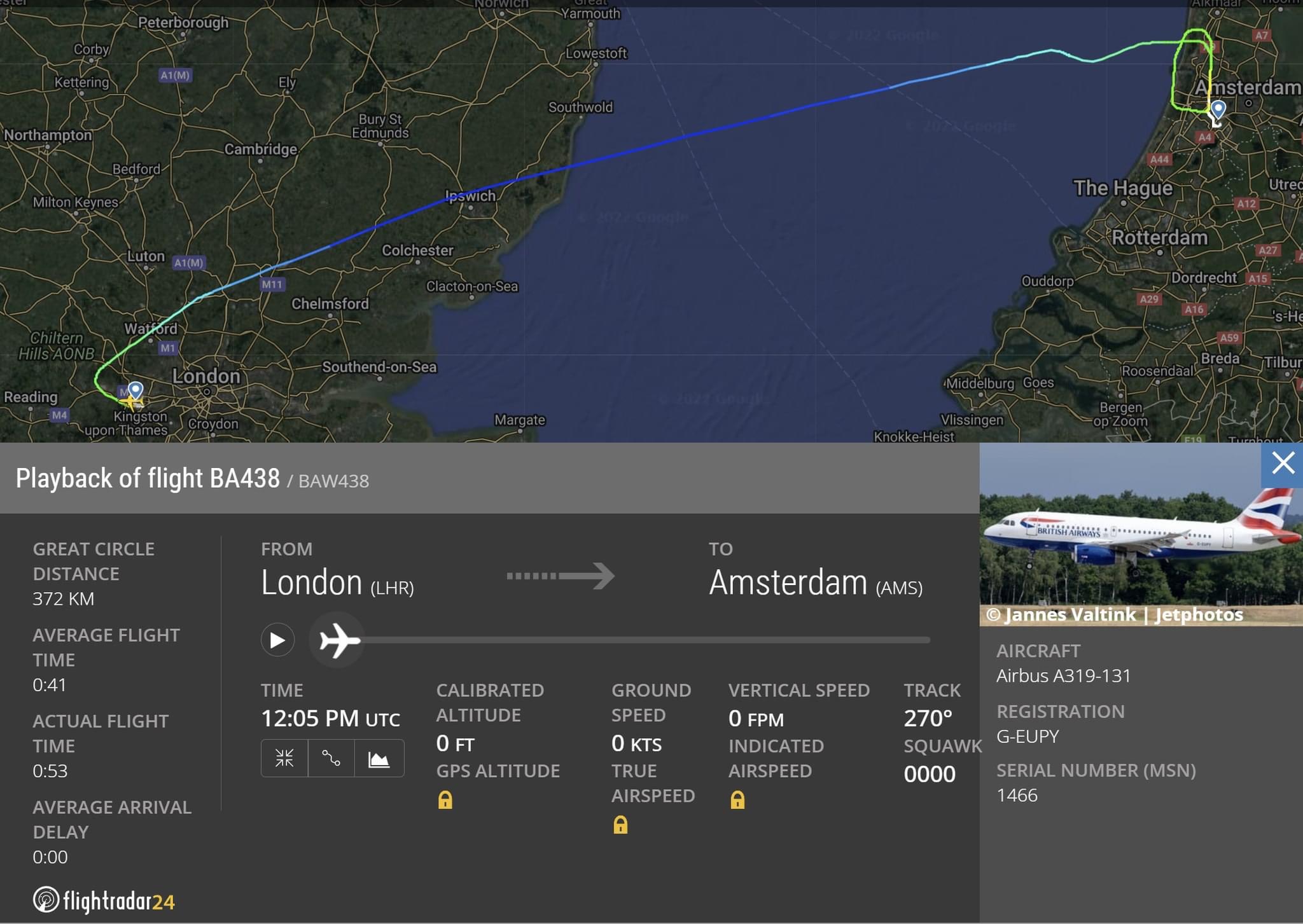 Il volo tra Londra e Amsterdam e’ relativamente breve, anche 42/47 minuti. In questo caso sono stati 53.