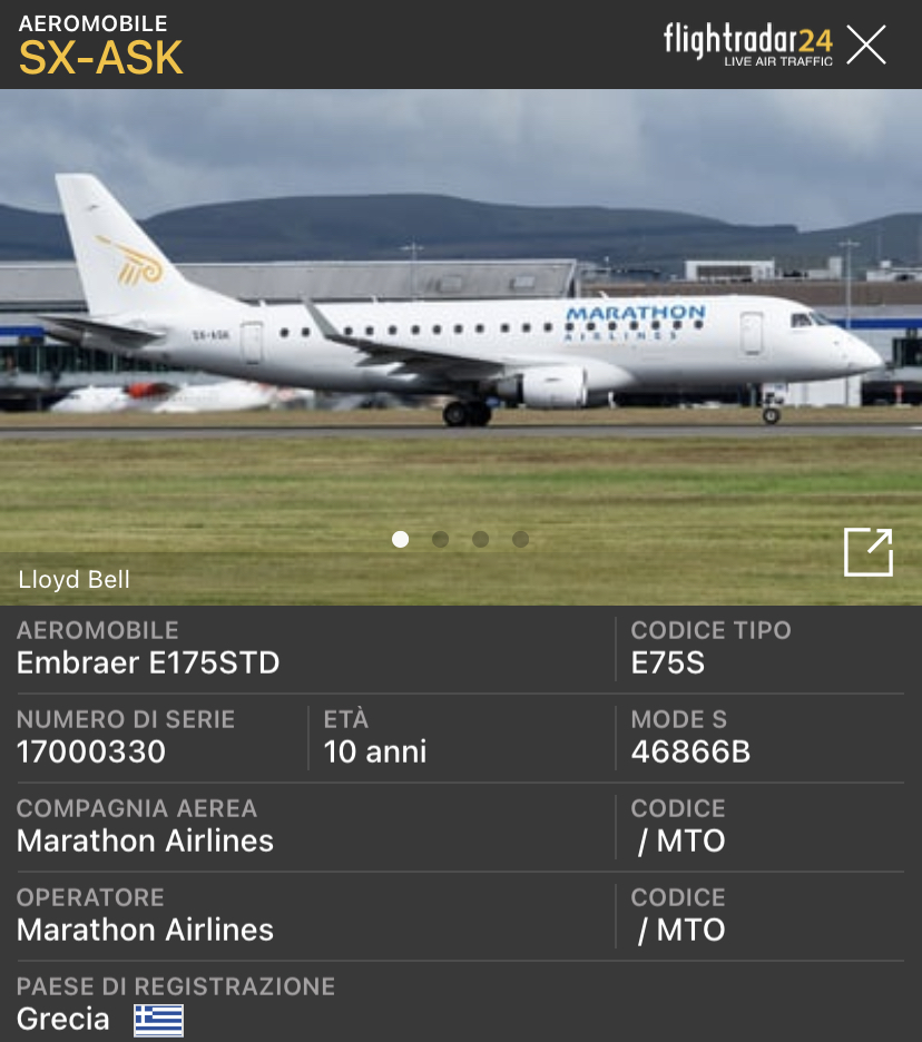 Per il momento e’ uno dei pochi aerei dismessi da Alitalia CityLiner ad aver trovato un nuovo operatore. Questo E175STD e’ il primo consegnato a suo tempo Alitalia CityLiner come EI-RDA. Oggi e’ operativo sul mercato dell’ad hoc charter o ACMI con l’operatore greco Marathon Airlines e le nuove marche SX-ASK.