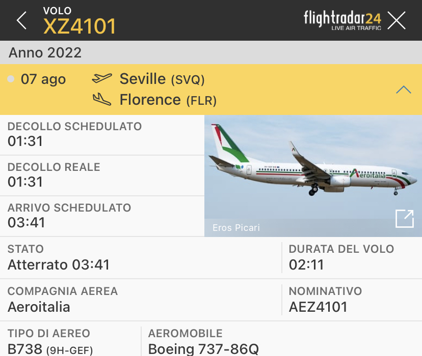 A Firenze , atterraggio in piena notte alle 3:41 per la Fiorentina a bordo del volo AeroItalia XZ4101 da Siviglia. La squadra gigliata aveva giocato con il Royal Betis Siviglia.
