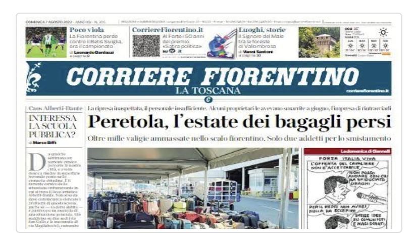La prima pagina di Corriere Fiorentino mostra la mole di bagagli arrivati in seguito a Firenze e in attesa di essere riconsegnati ai legittimi proprietari. E’ un esempio preso a caso, ma in tutti gli aeroporti italiani la situazione e’ più o meno così. Centinaia e centinaia, in molti casi in quelli più grossi sono migliaia i pezzi di bagaglio giunti dopo l’arrivo dei passeggeri sul volo originario.