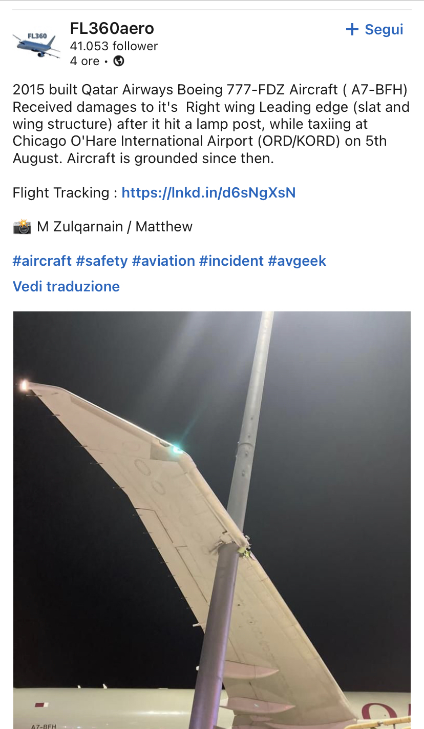 L’ala destra del velivolo A7-BFH lo ha preso quando stava andando alla piazzola di parcheggio il 5 agosto dopo il suo arrivo da Atlanta.