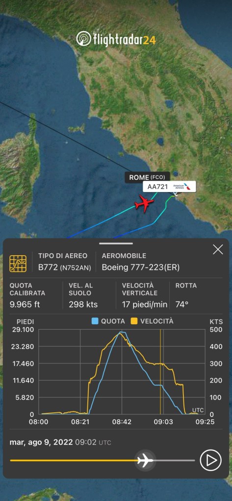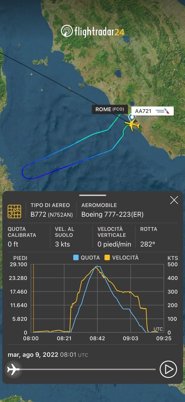 Il B777-223R N752AN e’ salito fino a FL282 quando quasi in prossimità della Sardegna ha fatto una virata a destra per ritornare a Roma Fiumicino.