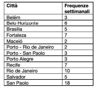 | TAP Air Portugal conferma la propria leadership in qualità di primo vettore per i collegamenti fra Brasile ed Europa. Nel primo semestre di quest’anno TAP Air Portugal ha trasportato 640.017 passeggeri – registrando un incremento del 526% rispetto allo stesso periodo del 2021 – e, di questi, il 28% di tutti i passeggeri trasportati tra il Brasile e l’Europa.Con 3.129 voli operati nel primo semestre di quest’anno, TAP si è confermato il primo vettore tra Europa e Brasile, registrando un incremento del 130% rispetto allo stesso periodo del 2021. Sul Brasile TAP Air Portugal è già all’86% della capacità rispetto al periodo pre-pandemico. Con un network di oltre 90 destinazioni nel mondo, il rafforzamento del numero di frequenze è un forte segnale di ripresa. Il Brasile continua a essere uno dei mercati prioritari per TAP Air Portugal che, anche nel secondo semestre, continuerà a investire nel proprio impegno al servizio dei passeggeri brasiliani. Un impegno che continua a fare di TAP il principale vettore internazionale che collega il Paese all’Europa. TAP offre attualmente dall’Europa voli diretti per San Paolo, Rio de Janeiro, Belém, Belo Horizonte, Brasília, Fortaleza, Natal, Maceió, Porto Alegre, Recife e Salvador. In totale, sono 11 le città brasiliane (13 rotte) che TAP collega direttamente all’Europa. Per l’estate europea, TAP opera 76 frequenze settimanali tra Brasile e Portogallo, il numero più alto di frequenze tra i vettori stranieri che operano in Brasile.Frequenze settimanali TAP Air Portugal fino al 30 settembre |