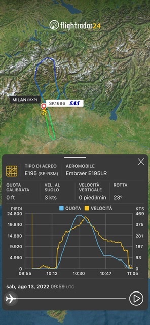 A quindici minuti dal decollo ferma la salita a FL250 e poi vira a sinistra e ritorna a Milano Malpensa.