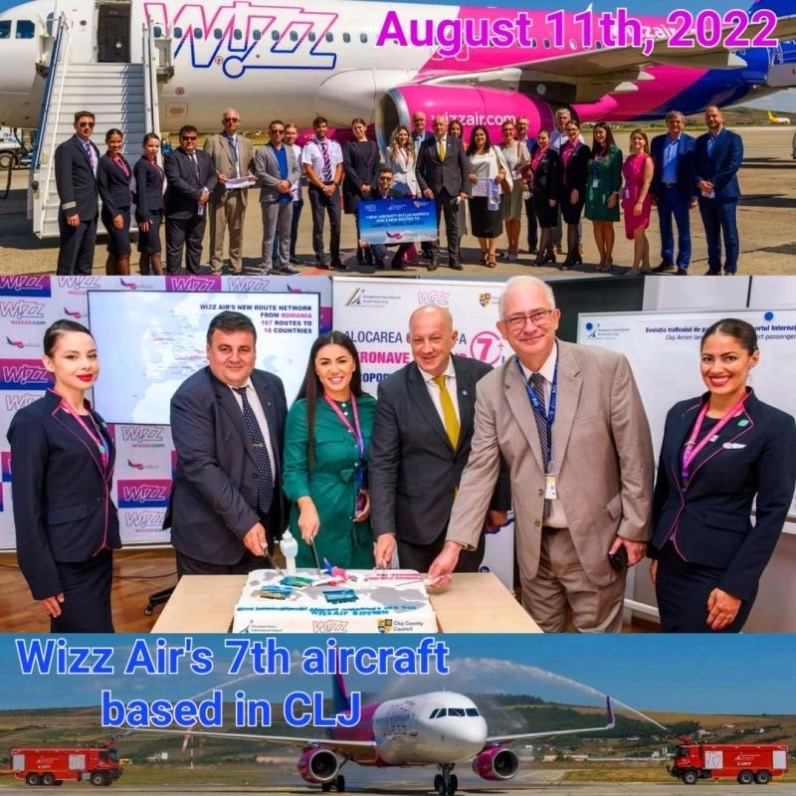 Tre foto in una che documentano l’arrivo e celebrazione del settimo aereo per la base rumena di Cluj Napoca della Wizz Air.